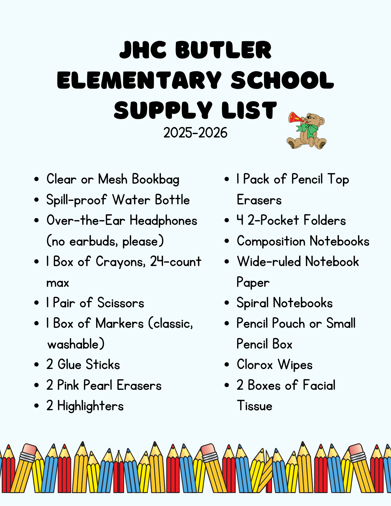 We are excited to welcome our students back to school for the 2024-25 school year! Please find the list of supplies requested by your child's school below to insure they arrive prepared for the first day. Please note that some teachers or grade levels may have additional requests that will be provided at Open House or the first day of school.